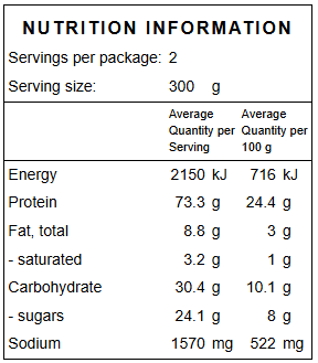 Ingredients: Beef, carrot, onion, celery, quinoa, hoisin sauce (sugar, soya bean, sweet potato, salt, thickener, acidity regulator, sesame seed, oyster sauce (water, sugar, oyster extract (mollusc), wheat flour, colour), plum sauce (plum puree, sugar, water, balsamic vinegar (sulphites), apple puree, acidity regulators), chilli, spices