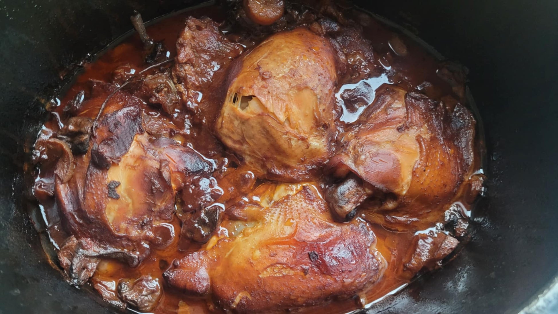 This rich red wine sauce infused with thyme and bacon, succulent vegetables and chicken that falls off the bone is a treat for the whole family. No water required, and the sauce at the end can be thickened with either flour (or cornflour) and water, or by boiling it down in a pan on the stove for an incredible rich, glossy jus that any chef would be impressed by.
