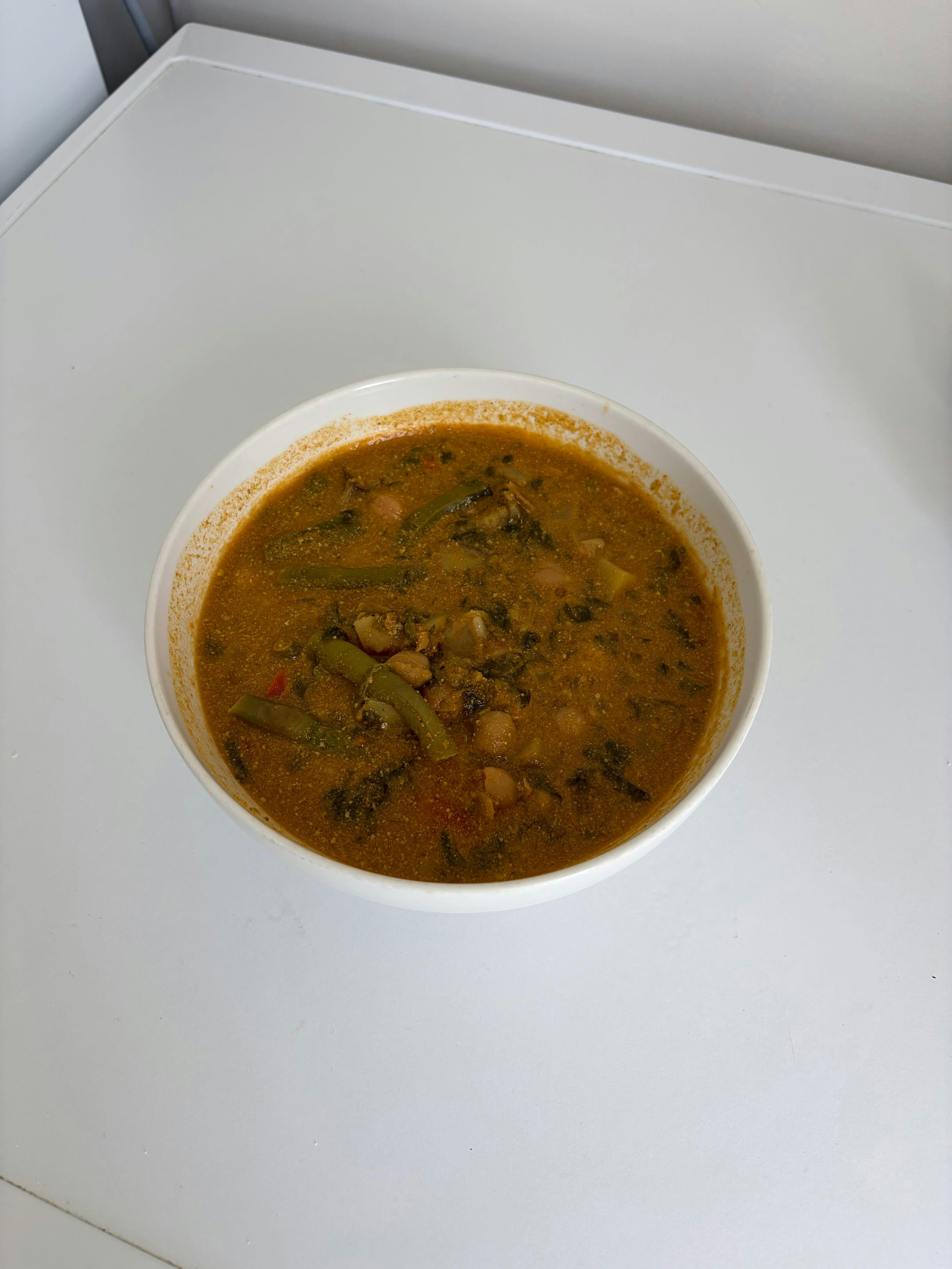 Ingredients: Kumara, chickpeas, onion, spinach, coconut cream (coconut cream, stabilisers (xanthem gum E415 & Guar Guar Gum E412), curry paste (chilli, lemongrass, shallot, garlic, salt, galangal sugar, coriander, Thai basil leaves kafir lime peel), spices.
